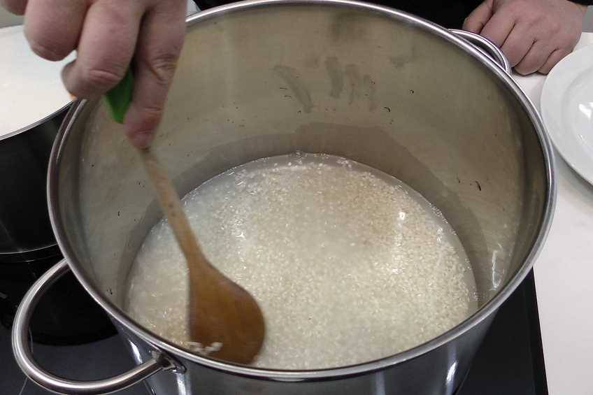 En otra olla, cocinamos el arroz en agua con una pizca de sal. El arroz lo echaremos cuando éste rompa a hervir y añadiremos la leche cuando ya el arroz haya absorbido toda el agua.